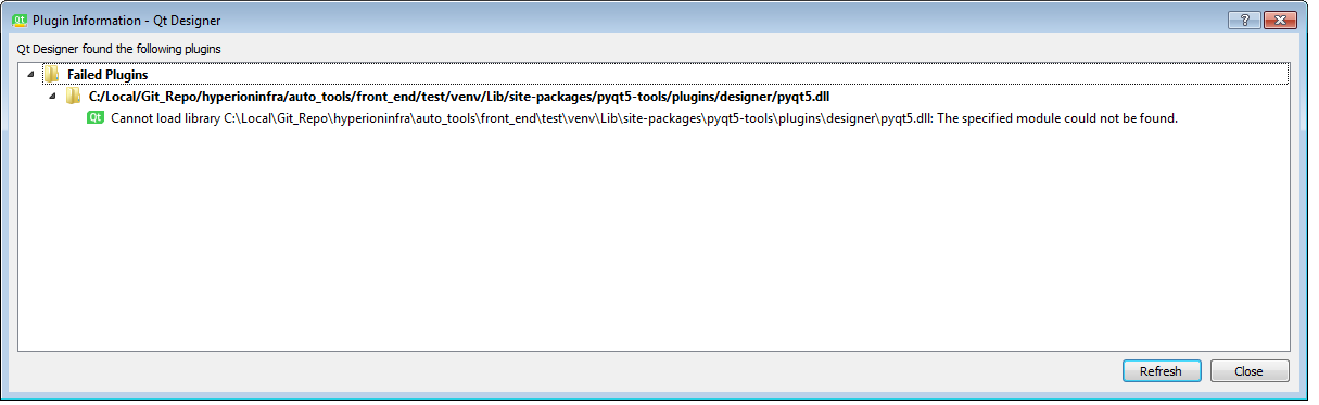 > Cannot load library C:\Local\Git_Repo\hyperioninfra\auto_tools\front_end\test\venv\Lib\site-packages\pyqt5-tools\plugins\designer\pyqt5.dll: The specified module could not be found.